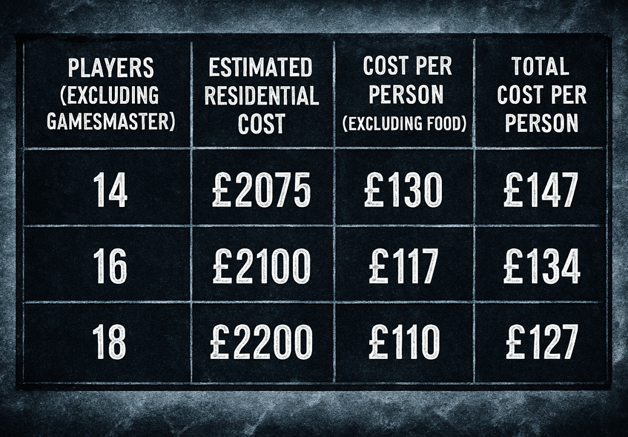 Residential budget is the cost to rent accommodation to function as both play and sleeping space. This will vary depending on the number of players booked, but may be flexible depending on the exact venue. We must raise this much per player to be able to provide the game.