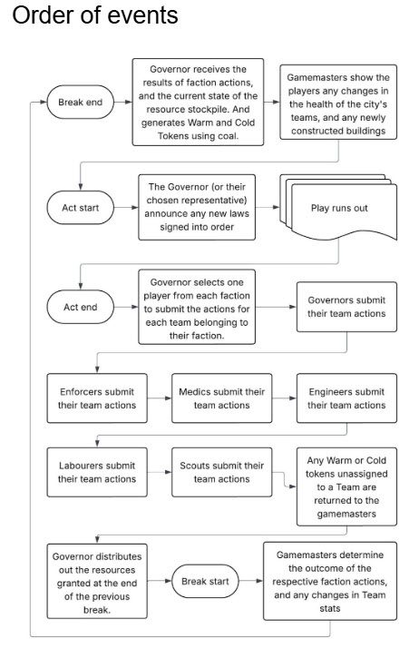 At the close of each Act, the Governor will select one representative from each faction to privately submit proposed actions for their teams. Then, the Governor will distribute those resources acquired at the Act’s opening—before learning whether those faction actions succeeded or failed. A more developed step-by-step on the order of events outside of Roleplay can be found at the bottom of this page.